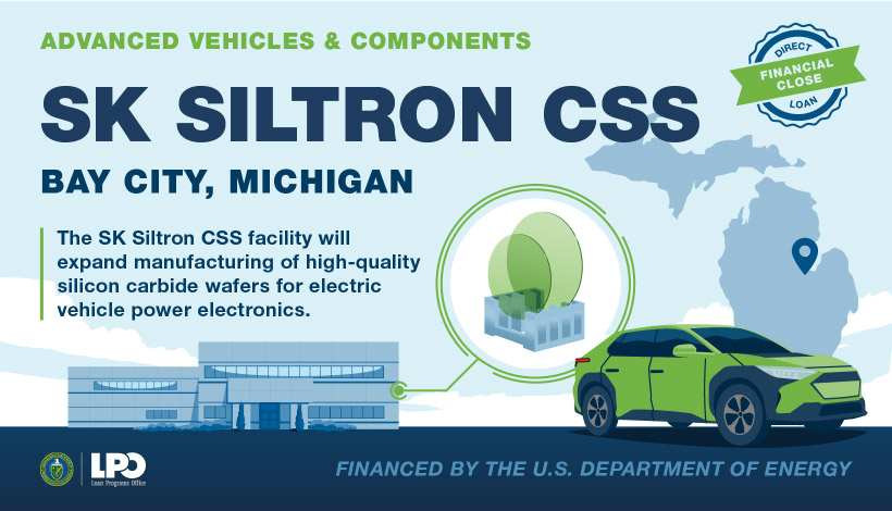 Following the announcement in February of a conditional commitment, as part of the Biden–Harris Administration’s Investing in America agenda the US Department of Energy (DOE) has now confirmed a $544m loan ($481.5m of principal and $62.5m of capitalized interest) to compound semiconductor wafer maker SK Siltron CSS LLC of Auburn, MI, USA (a subsidiary of South Korea-based wafer manufacturer SK Siltron, a part of South Korea’s second-largest conglomerate SK Group) to expand American manufacturing of high-quality silicon carbide (SiC) wafers for electric vehicle (EV) power electronics.