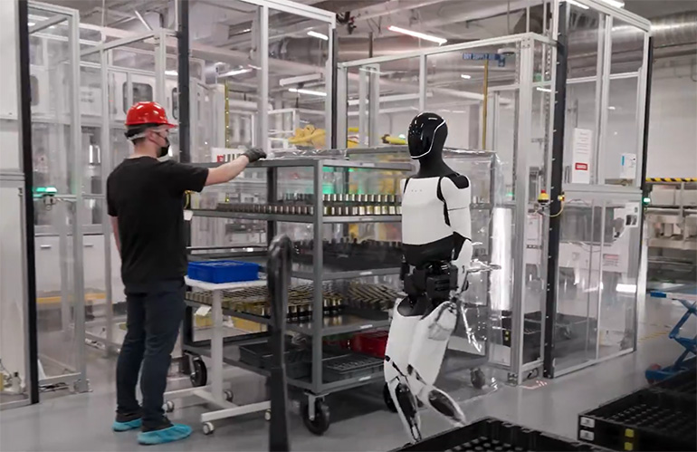A Tesla Optimus humanoid robot walks through a factory with people. Predictable robot behavior requires priority-based control and a legal framework. Credit: Tesla