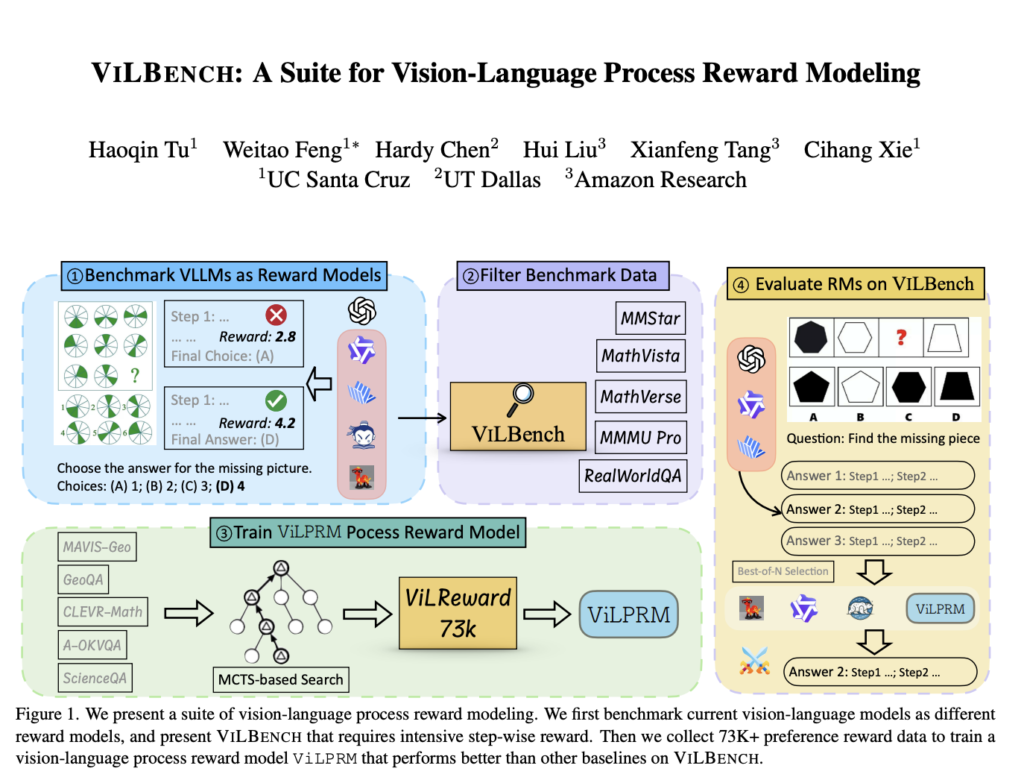 Researchers from UC Santa Cruz, UT Dallas, and Amazon Research benchmarked VLLMs as ORMs and PRMs across multiple tasks, revealing that neither consistently outperforms the other. To address evaluation gaps, they introduced VILBENCH, a benchmark requiring step-wise reward feedback, where GPT-4o with Chain-of-Thought achieved only 27.3% accuracy. Additionally, they collected 73.6K vision-language reward samples using an enhanced tree-search algorithm, training a 3B PRM that improved evaluation accuracy by 3.3%. Their study provides insights into vision-language reward modeling and highlights challenges in multimodal step-wise evaluation.