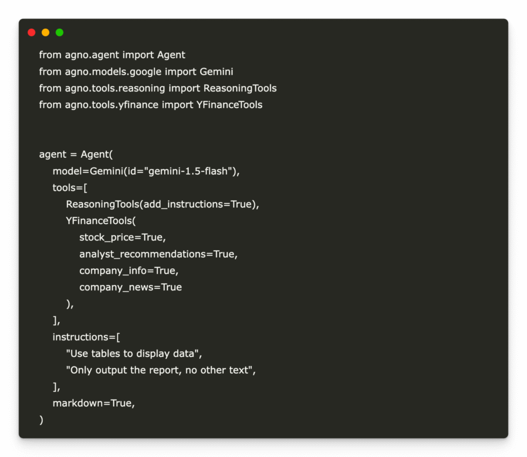 We initialize an Agno agent powered by Google’s Gemini (1.5 Flash) model, equip it with reasoning capabilities and YFinance tools to fetch stock data, analyst recommendations, company information, and news, and then stream a step-by-step, fully transparent report on AAPL, complete with chained reasoning and intermediate tool calls, directly to the Colab output.