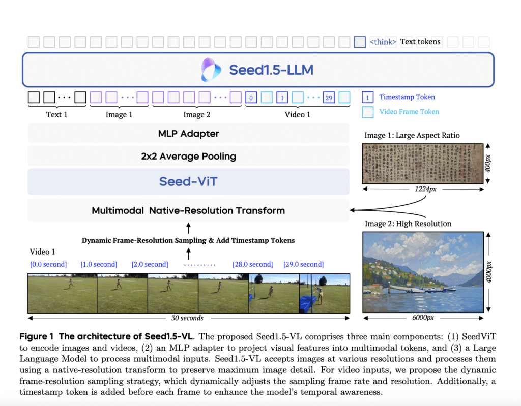 The Seed1.5-VL architecture features a vision encoder, an MLP adapter, and an LLM. Its custom vision encoder, Seed-ViT, supports native-resolution image input using 2D RoPE and processes images through 14×14 patches, followed by average pooling and an MLP. Pretraining involves masked image modeling, contrastive learning, and omni-modal alignment using images, text, and video-audio-caption pairs. The model uses a Dynamic Frame-Resolution Sampling approach for video encoding that adapts frame rates and resolutions based on content complexity, balancing efficiency and detail. This method enables effective spatial-temporal understanding within a token budget, ensuring comprehensive video representation across varied lengths and complexities.