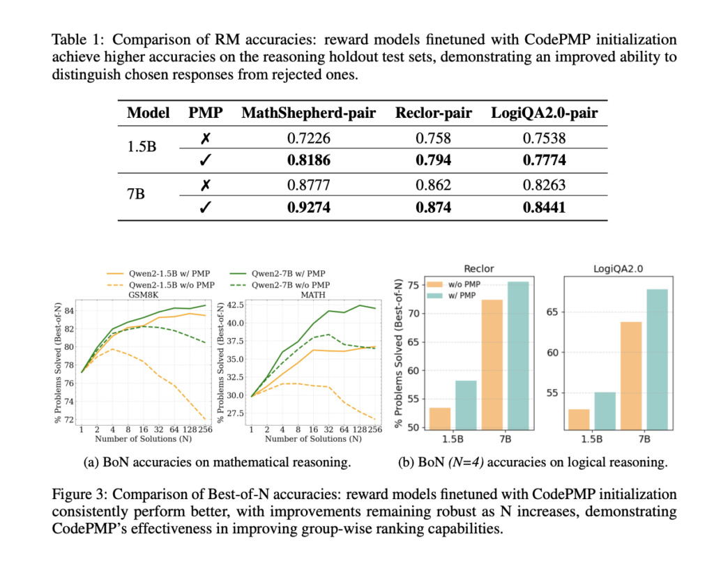 CodePMP demonstrated significant improvements in reasoning performance across mathematical and logical reasoning tasks. Models pre-trained with CodePMP consistently outperformed those without it in both RM accuracy and Best-of-N performance. These improvements were seen across both 1.5B and 7B model sizes. For example, in mathematical reasoning tasks, the model achieved substantially higher accuracy, and in logical reasoning tasks, it displayed enhanced ability to differentiate between correct and incorrect reasoning steps. The results highlight the effectiveness of CodePMP in boosting RM fine-tuning efficiency, resulting in better generalization and performance across diverse reasoning domains.