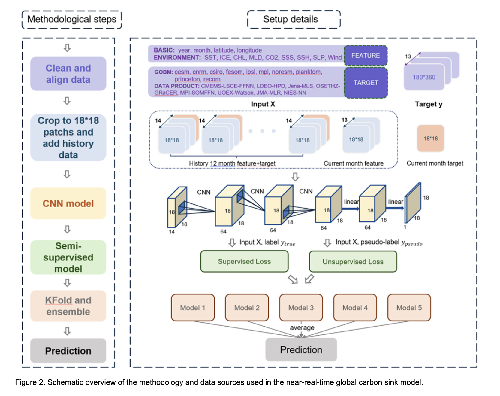 The proposed AI-based model utilizes environmental variable observations and historical data to predict global carbon sink levels. The model integrates 12 months of historical data, monthly features, and target outputs. CNNs process this data to compute predictions, while semi-supervised learning provides an unsupervised loss function to improve prediction accuracy. The model processes environmental data from ocean and land sinks and satellite fire emissions to provide real-time updates on CO2 sinks. This methodology ensures that predictions are made with a margin of error of less than 2%, offering a fast, responsive alternative to traditional carbon budgeting methods.