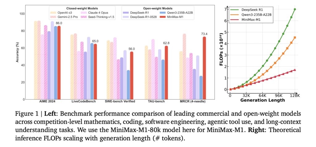 MiniMax-M1 delivered compelling benchmark results. Compared to DeepSeek-R1 and Qwen3-235B, it excelled in software engineering, long-context processing, and agentic tool use. Although it trailed the latest DeepSeek-R1-0528 in math and coding contests, it surpassed both OpenAI o3 and Claude 4 Opus in long-context understanding benchmarks. Furthermore, it outperformed Gemini 2.5 Pro in the TAU-Bench agent tool use evaluation.