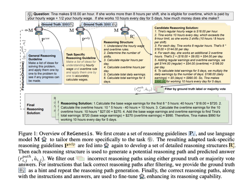 The methodology behind ReGenesis is structured into three key phases. First, it generates broad, task-agnostic reasoning guidelines that are general principles applicable to various tasks. These guidelines are not tied to any particular problem, which allows the model to maintain flexibility in its reasoning. Next, these abstract guidelines are adapted into task-specific reasoning structures, allowing the model to develop more focused reasoning strategies for particular problems. Finally, the LLM uses these reasoning structures to create detailed reasoning paths. Once the paths are generated, the model filters them using ground-truth answers or majority-vote techniques to eliminate incorrect solutions. This process, therefore, enhances the model’s reasoning capabilities without relying on predefined examples or extensive human input, making the entire process more scalable and effective for a range of tasks.