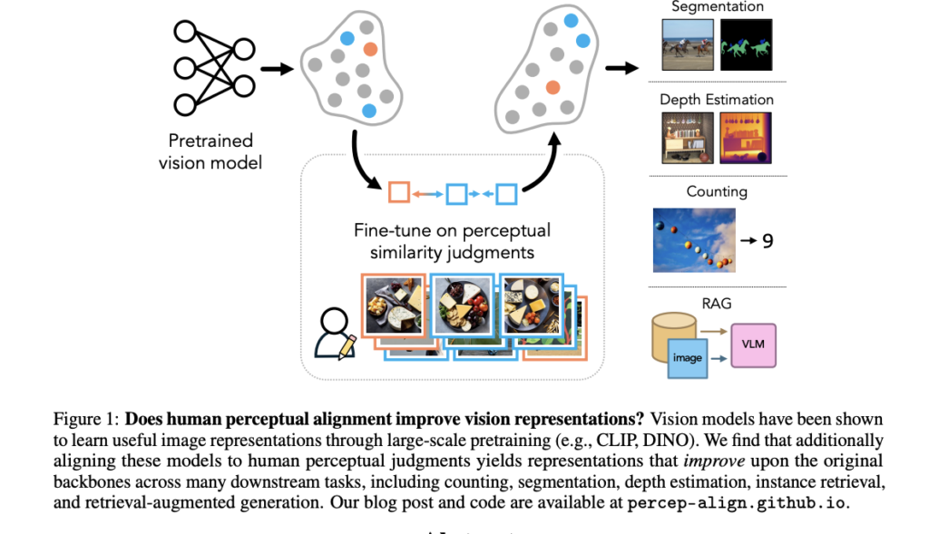 Researchers from MIT and UC Berkeley analyze this question in depth. Their paper “When Does Perceptual Alignment Benefit Vision Representations?” investigates how a human vision perceptual aligned model performs on various downstream visual tasks. The authors finetuned state-of-the-art models ViTs on human similarity judgments for image triplets and evaluated them across standard vision benchmarks. They introduce the idea of a second pretraining stage, which aligns the feature representations from large vision models with human judgments before applying them to downstream tasks.